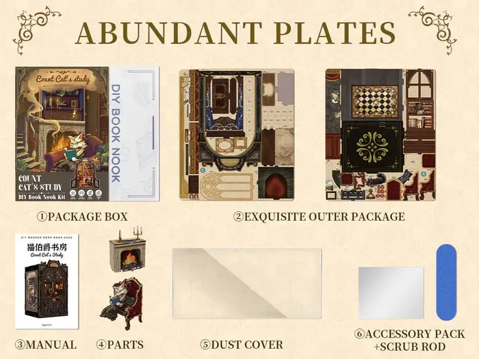 La luz integrada en Count Cat’s Study resalta los detalles, creando un ambiente cálido y misterioso, ideal para iluminar tu espacio de lectura.